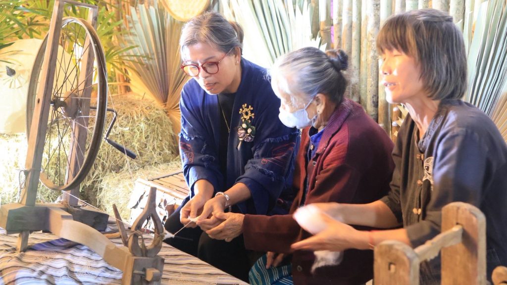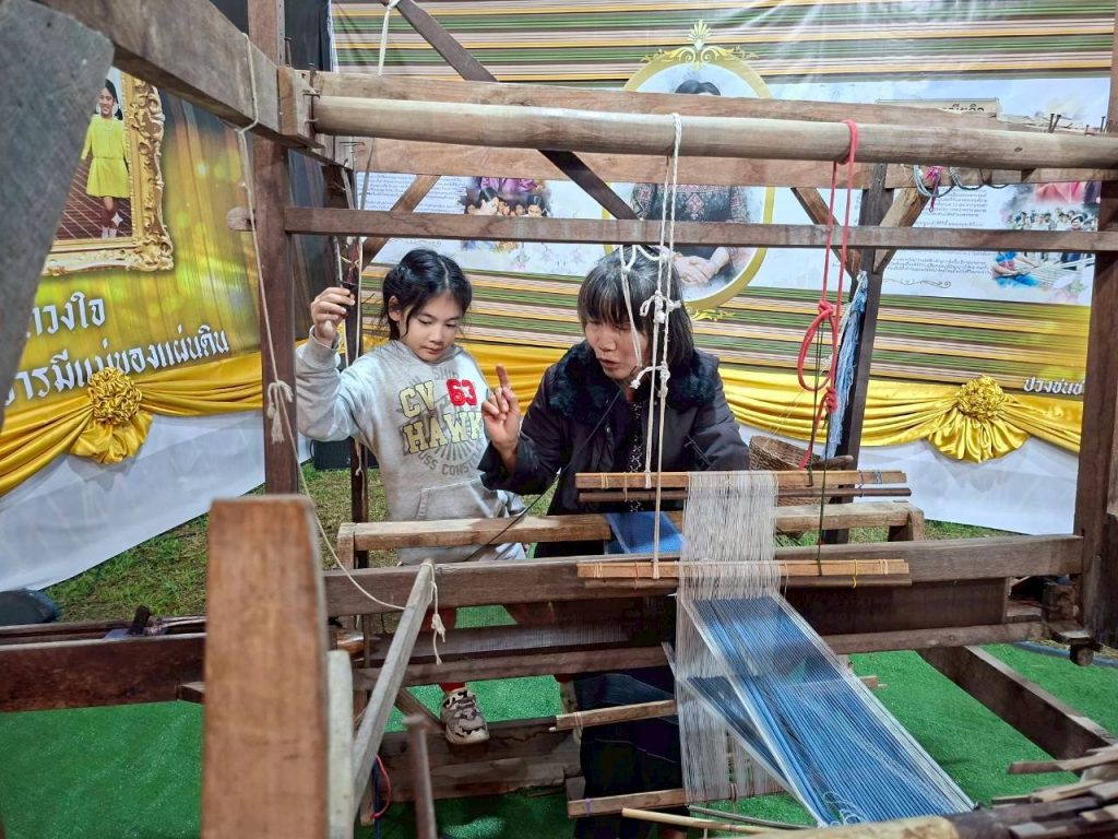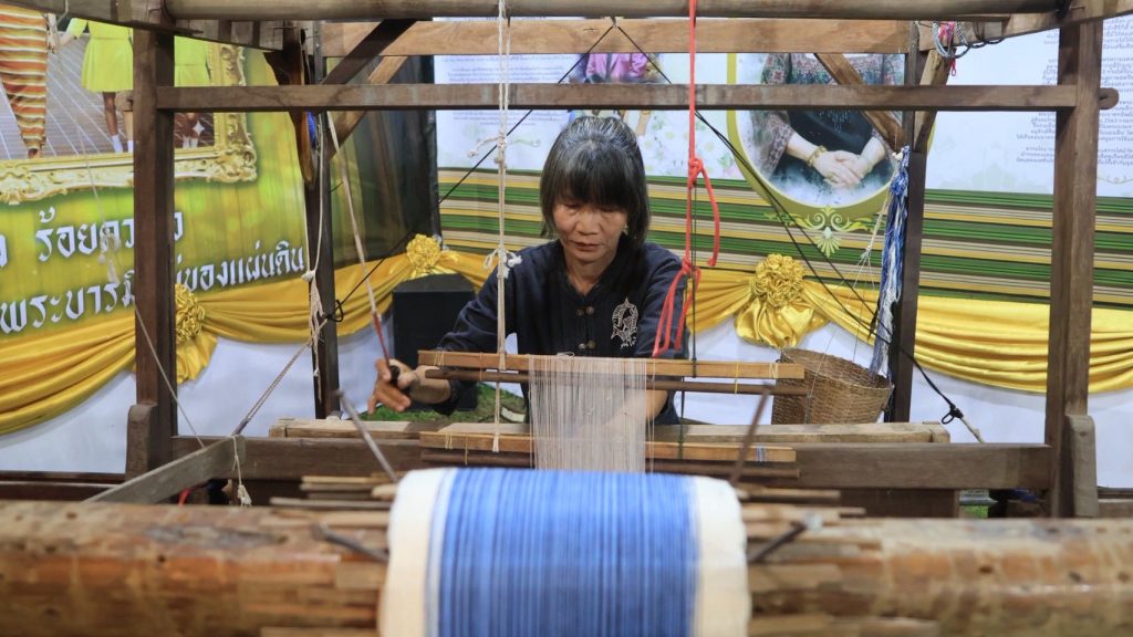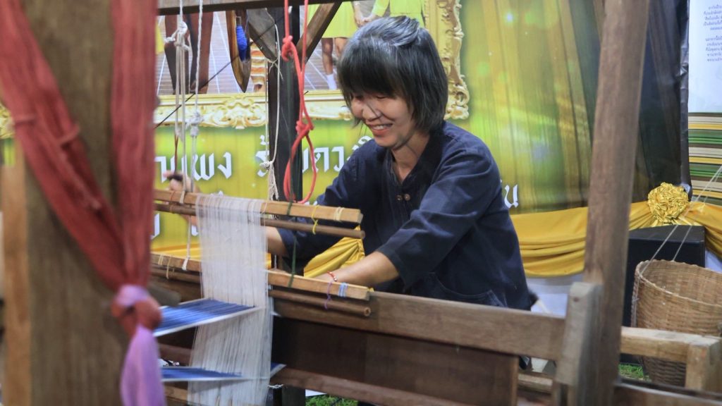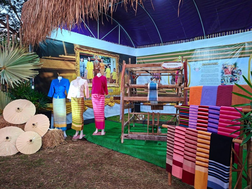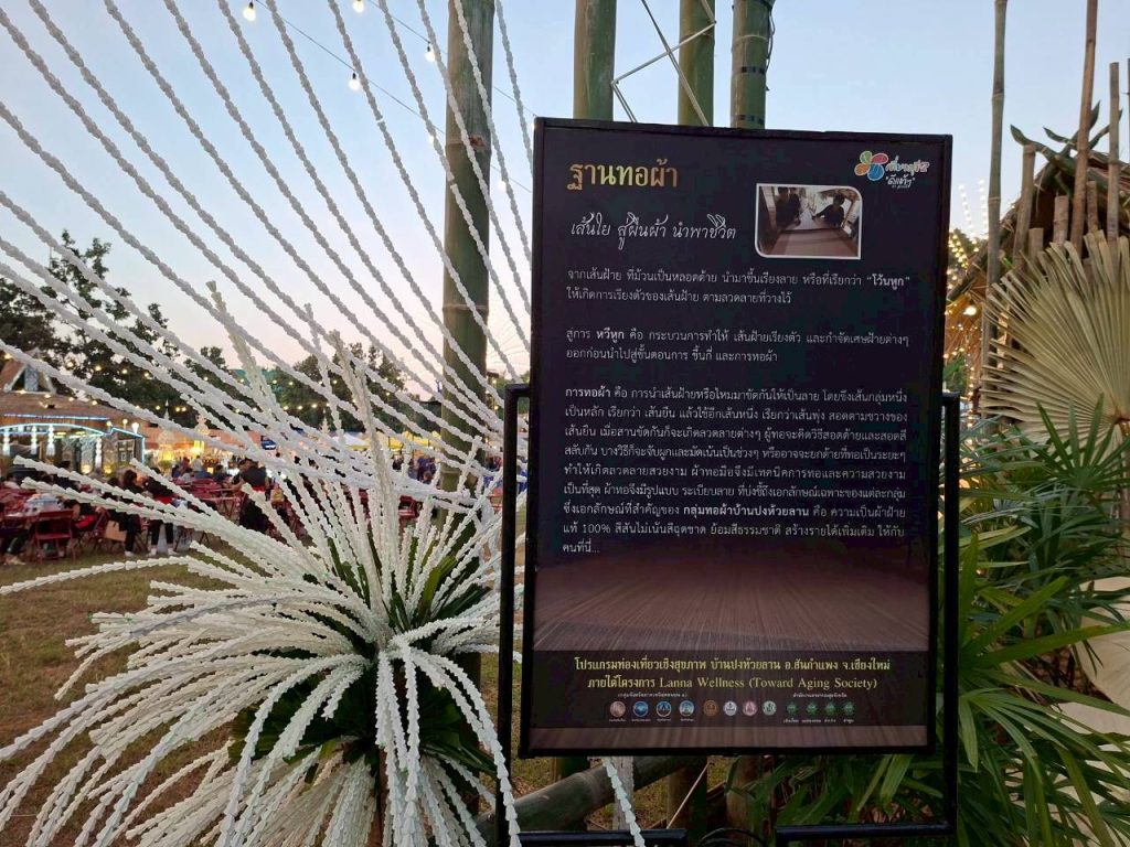 ตำบลออนใต้ ได้แรงบันดาลใจจากลายผ้าซิ่นลายสันกำแพงที่สมเด็จพระนางเจ้าสิริกิติ์ พระบรมราชินีนาถ พระบรมราชชนนีพันปีหลวง ได้ทรงผ้าเมื่อครั้งอดีต มานำเสนอผ่านผลงานหัตถศิลป์ “การทอผ้าซิ่นสันกำแพง” ซึ่งเป็นผลงานหัตถกรรมที่ยังคงมีการประกอบอาชีพอยู่ที่บ้านปง ตำบลออนใต้ อำเภอสันกำแพง โดยแม่อารีย์ ใจวงค์ แหล่งเรียนรู้ผ้าทอ จากศูนย์เรียนรู้และแหล่งท่องเที่ยวเชิงอนุรักษ์บ้านปงห้วยลาน มาให้ความรู้ในซุ้มนิทรรศการ ผ่านฐานการทอผ้า จากเส้นใย สู่ผืนผ้า นำพาชีวิต สร้างรายได้ให้แก่ครัวเรือน